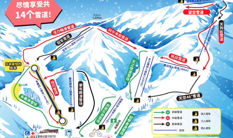 初级者滑雪路线是一种为了让初学者也能够放心滑行而制作了坡度平缓、宽阔的滑雪路线。首先,建议在初级者滑雪路线上练习好基础之后再去其他滑雪路线滑行!