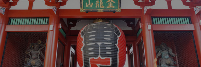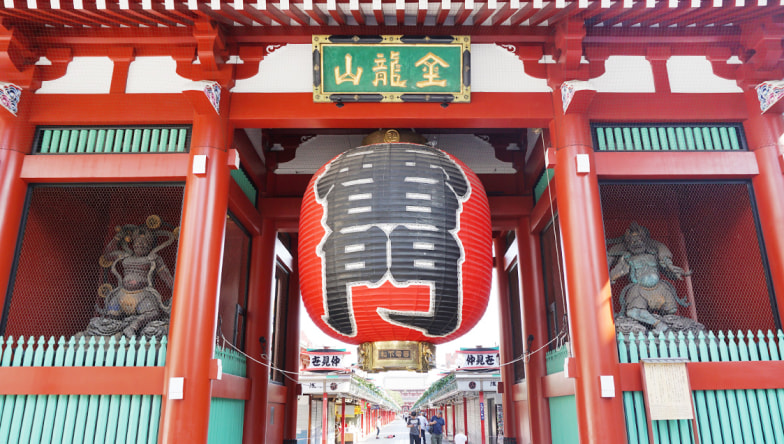 由风神、雷神守护的浅草寺总门。写有“雷门”的红色大灯笼是浅草的象征。