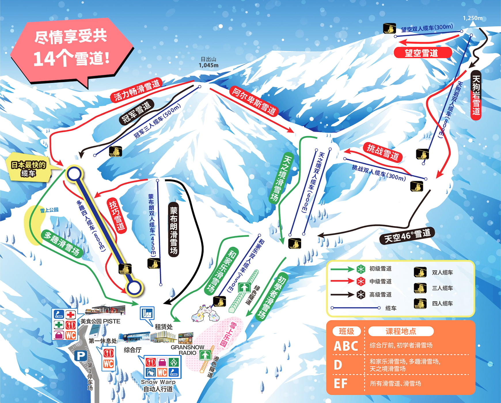 缆车、租借装备、滑雪培训、餐厅、区间巴士等