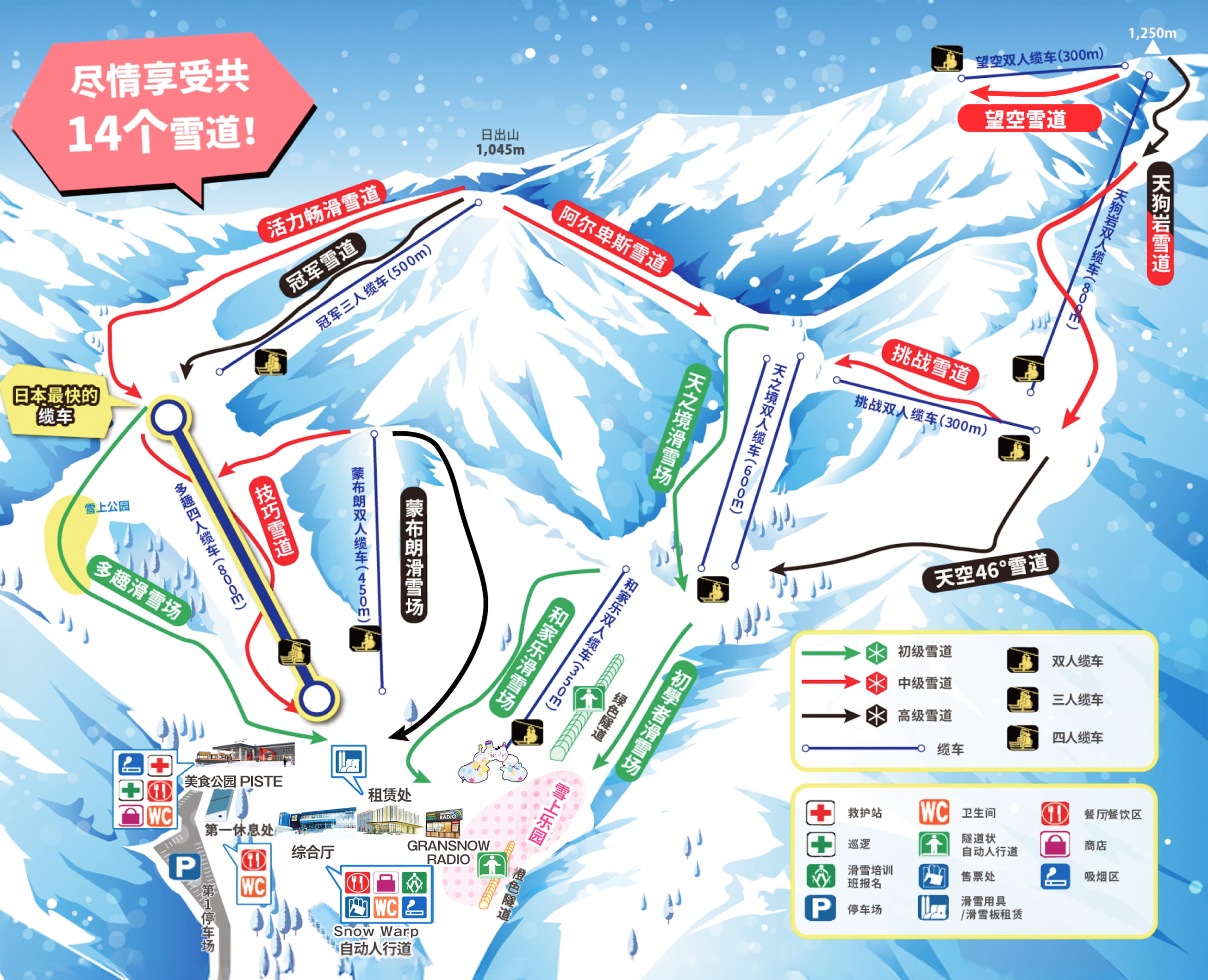 技巧雪道 是一条从滑雪场基地乘坐缆车直达的中度斜面滑雪道。 |